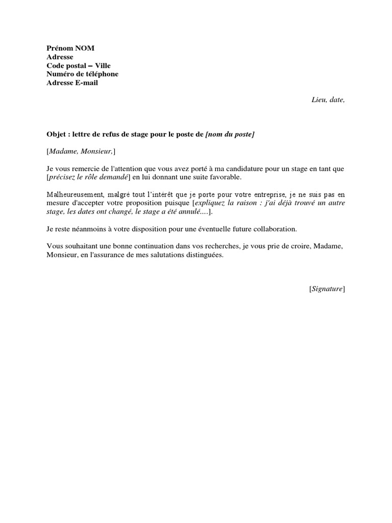 Lettre Refus De Stage Par Le Demandeur